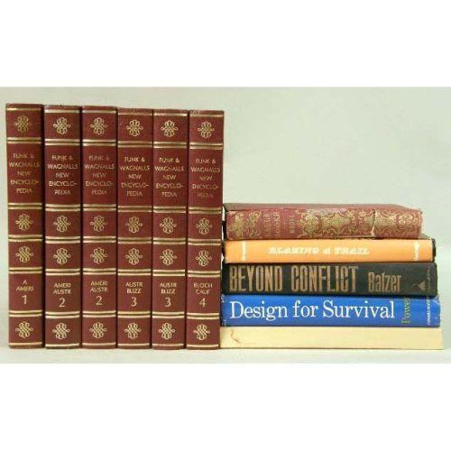 A MISCELLANEOUS GROUP OF BOOKS<BR><BR>including six volumes of Funk & Wagnall`s New Encyclopedia, books on military strategy, novels, poems and preservationist history. 11 pieces.