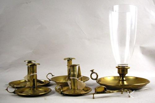 A MISCELLANEOUS GROUP OF BRASS CHAMBER STICKS; together with a pair of cast brass three-light wall sconces and a pair of brass scissor-form snuffers, wear, repairs and cracks