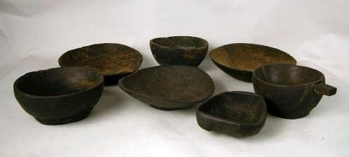 A MISCELLANEOUS GROUP OF CARVED WOODEN BOWLS AND SHALLOW DISHES; Various levels of distress and repairs, 7 pieces