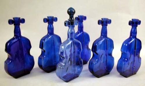 A MISCELLANEOUS GROUP OF COBALT BLUE GLASS "VIOLIN" BOTTLES: Randomly stamped 1 through 7 Height 8"