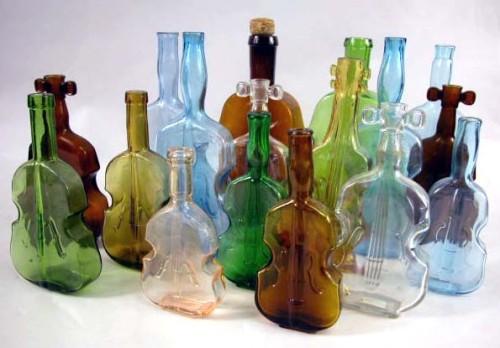 A MISCELLANEOUS GROUP OF COLORED GLASS "VIOLIN" BOTTLES; (18 pieces) From height 6 1/2" to 10 1/4"