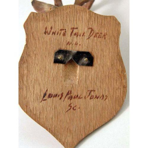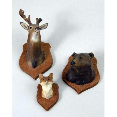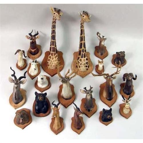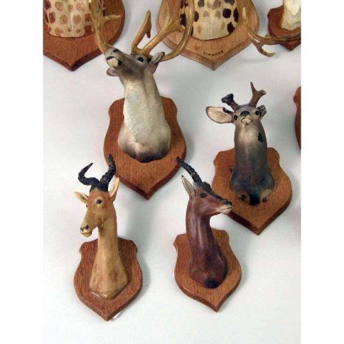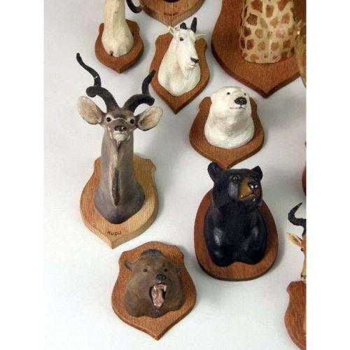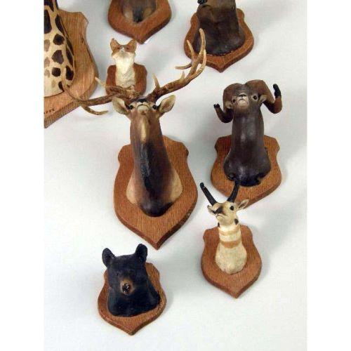 A MISCELLANEOUS GROUP OF COMPOSITION HANDPAINTED MINIATURE ANIMAL HEADS<BR><BR>Mounted on wall plaques, bears signature "Louis Paul Jonas," including, giraffes, sheep, bears, and deer, losses. From 2"h to 12"h. 20 pieces