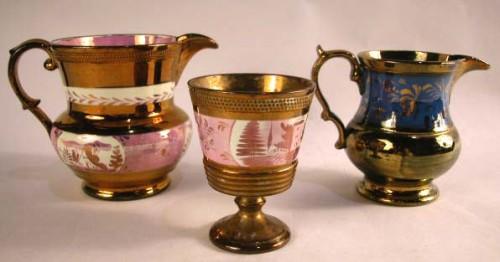 A MISCELLANEOUS GROUP OF COPPER LUSTERWARES; Comprising, two pitchers and one chalice (cracks, repairs, and wear) Heights from 4 14" to 5"
