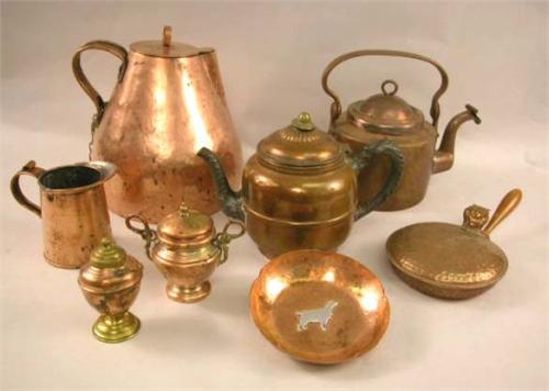 A MISCELLANEOUS GROUP OF COPPER TABLE ARTICLES; Comprising fourteen pieces, which include kettles, molds, trays and various other items