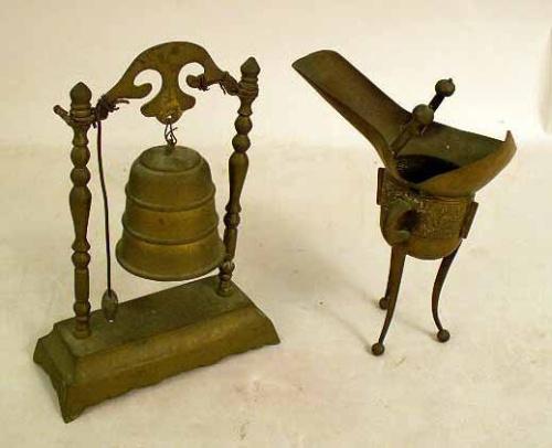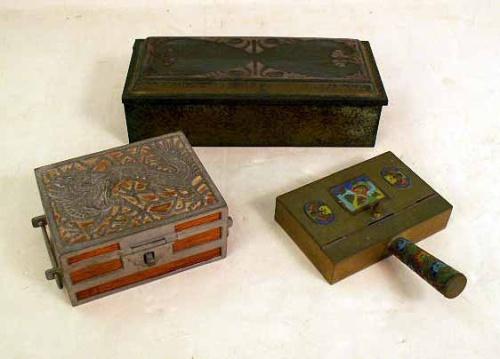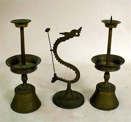 Comprising two locks with keys, two dragon form dinner bell stands, two ashtrays, an incense burner, lacking lid, a pair of pricket candlesticks, an oil lamp, a pair of brass filigree finials, a pewter inlaid teakwood box, a Cross sterling bronze box, and