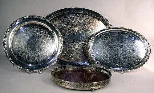 A MISCELLANEOUS GROUP OF FIVE SILVER-PLATE SERVING TRAYS; Of various sizes and design