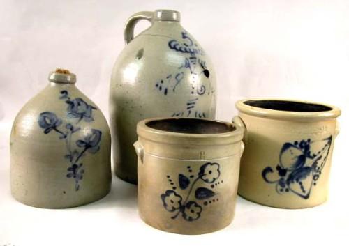 A MISCELLANEOUS GROUP OF FOUR COBALT-DECORATED STONEWARE VESSELS; American, comprising two jugs and two crocks (chips, cracks, losses, and repairs) Heights from 8" to 19"