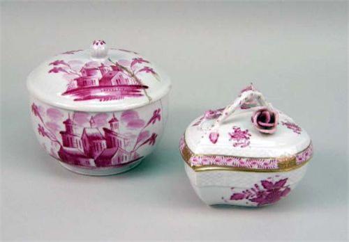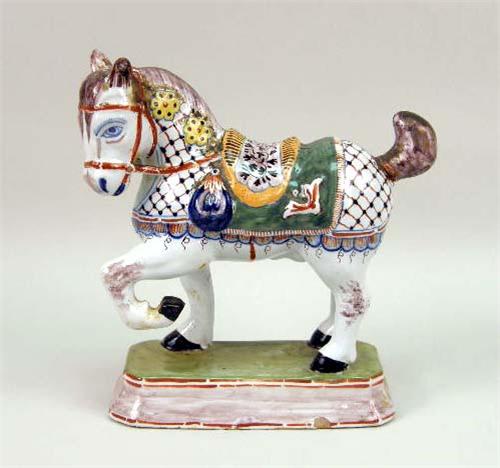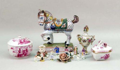 Comprising a piercework miniature, a covered urn with a cherub-motif, a Dresden candle holder, a rose and eight miniature figures. Together with a Herend covered box, a painted terracotta prancing horse, and a circular covered box. 14 pieces. From 2 1/4"h to 6 1/2"h