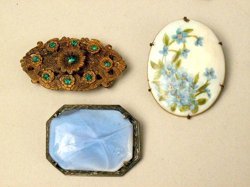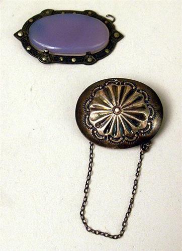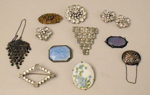 Comprising a sterling silver and hardstone brooch, a sterling silver and hardstone pendant, a porcelain brooch, a Native American style concho brooch, a gold tone dress clip, and four large imitation diamond dress clips and two brooches. 11 pieces.