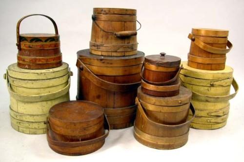 A MISCELLANEOUS GROUP OF NINE WOOD FIRKINS; American, of typical form, some painted Heights from 5" to 12"
