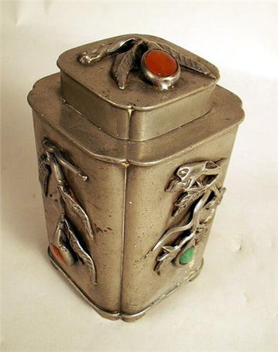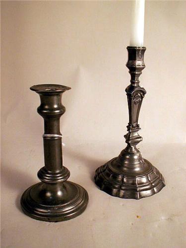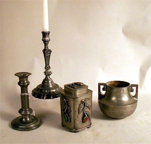 Comprising a Georgian style candlestick (bears two touch marks), an ejector candlestick, a hardstone mounted covered cannister, and a double handled vase. Wear throughout. From 5 1/4" to 9 1/2"h. 4 pieces.