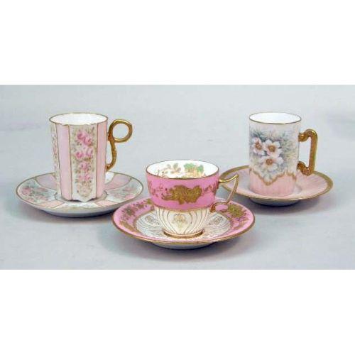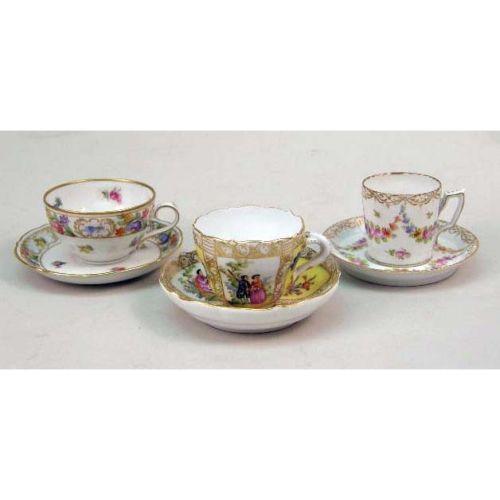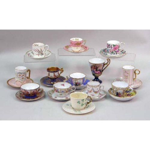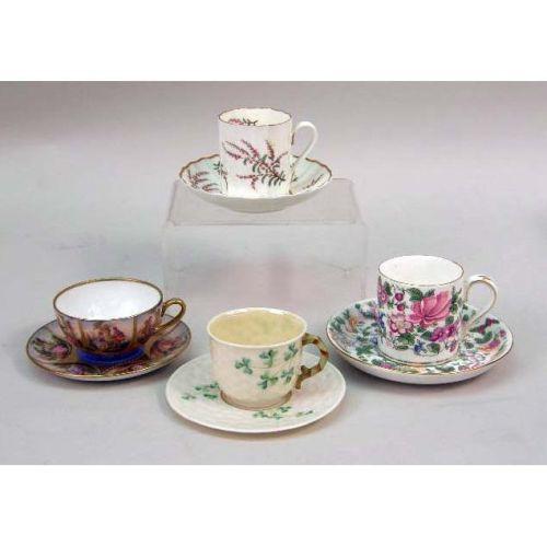 A MISCELLANEOUS GROUP OF POLYCHROME-DECORATED PORCELAIN CUPS AND SAUCERS<BR><BR>Including, marks from Meissen, Dresden, Bavaria, England, Beleek, and Germany. Wear. Approximately 25 pieces