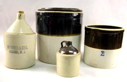 A MISCELLANEOUS GROUP OF SIX STONEWARE VESSELS; American, comprising four crocks and two jugs, three crocks and one jug have brown and cream glazes, the remaining are cream colored with some cobalt decoration, (various chips, cracks, and repairs) Height from 6 1/2" to 13 13/4"