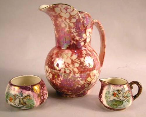 A MISCELLANEOUS GROUP OF SPATTERED PINK LUSTERWARES; Comprising, five creamer/pitchers, a caster and a sugar bowl 7 pieces