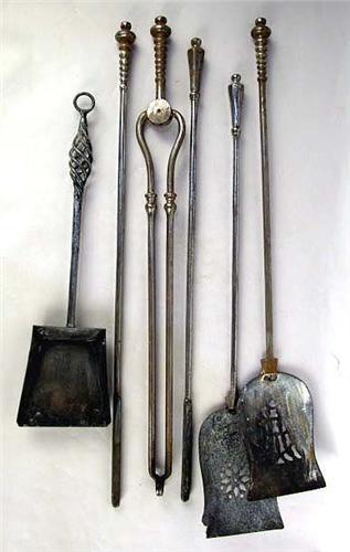 A MISCELLANEOUS GROUP OF STEEL FIRE TOOLS; Comprising a set of tongs, poker and shovel, a similar poker and shovel and a shovel 6 pieces