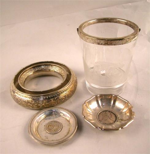 A MISCELLANEOUS GROUP OF STERLING SILVER AND SILVER PLATED ITEMS ON AN OVAL SILVER PLATED TRAY; Including a silver mounted ice bucket, 6 1/4"l