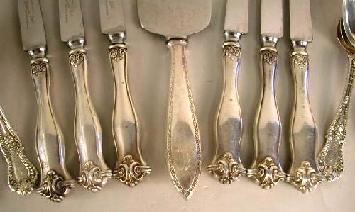 A MISCELLANEOUS GROUP OF STERLING SILVER FLATWARE ITEMS; Comprising: a set of six sterling handled steak knives, six sterling silver spoons, a sterling handled cake server, a gravy ladle, a mustard ladle, a cold meat fork, a condiment fork, a souvenir fork, and four spoons, apx. 14 T.O. weighable