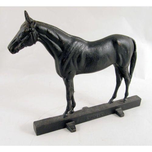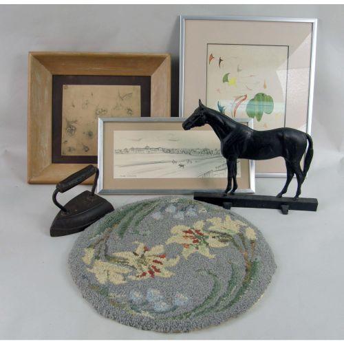 A MISCELLANEOUS GROUP OF TABLE ARTICLES<BR><BR>Including, a framed polychrome print, bears signature, R.A. Sakahn, a print of a horse race, a horse-form doorstop, and an iron, 10 1/2"h. 6 pieces