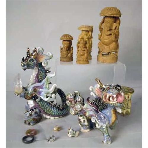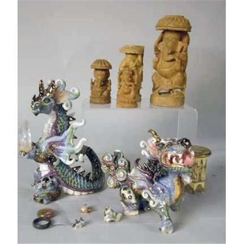 A MISCELLANEOUS GROUP OF TABLE ARTICLES<BR><BR>Including two polychrome and parcel-gilt decorated foo dogs, mounted with semi-precious stones, signed "RK Gheen," four carved deity figures, and a covered box, 7 1/2"h 7 pieces
