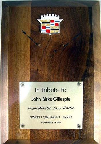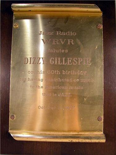 A MISCELLANEOUS GROUP OF THREE RADIO PRESENTATION PLAQUES Comprising a "WBBG Big Band Hall of Fame" for "Swingos at the Statler, December 5, 1982", a plaque inscribed, "In tribute to John Birks Gillespie from WRVR Jazz Radio Swing Low, Sweet Dizzy, September 13, 1975", losses to applique, and a brass placard in the shape of a scrolled paper engraved "Jazz Radio WRVR Salutes Dizzy Gillespie on his 60th birthday having contributed so much to the American Music that is Jazz, October 21, 1977", 3 pieces