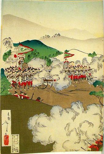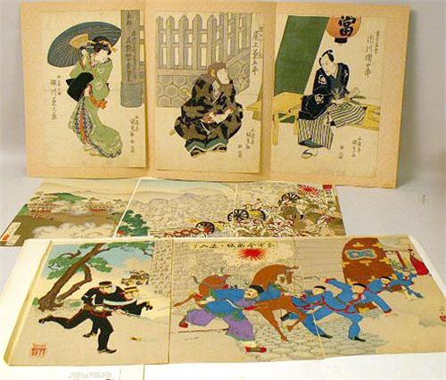 Japanese, one bears signature Ginko, depicting the Sino-Japanese War, the next attributed to Toshiaki, depicting a war, the last depicting two samurai and a lady holding a parasol. Folds, foxing and discoloration. Each panel approximately 15"h x 10"w.