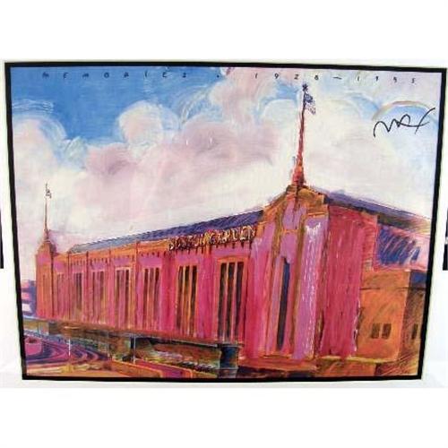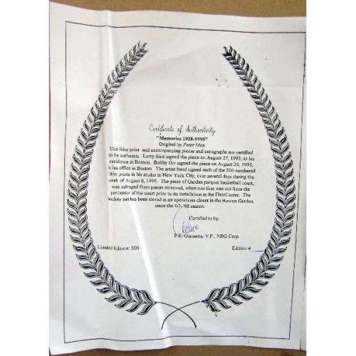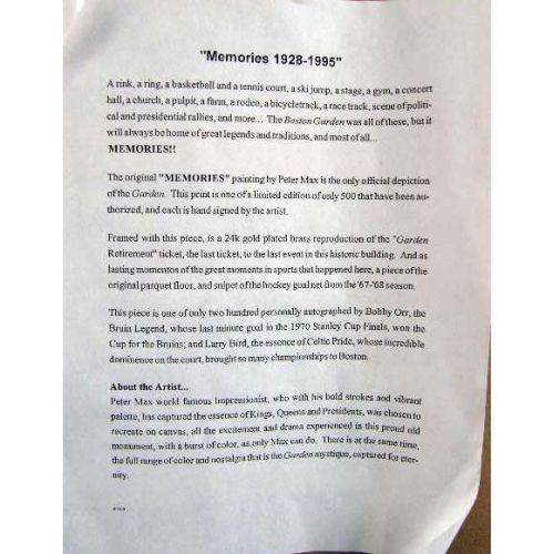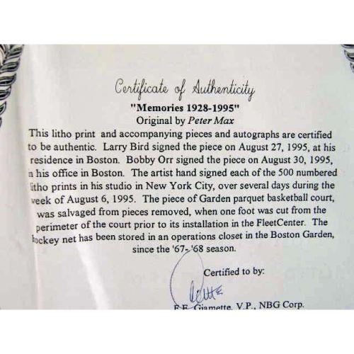 A MIXED MEDIA OF BOSTON GARDEN<BR><BR>Titled "Memories 1928-95." Signed by Peter Max. Comprising a lithograph of Boston Garden, a piece from the floor of the basketball court and a swatch of the hockey net. Verso bears Certificate of Authenticity. Also bears signatures of Larry Bird and Bobby Orr.
