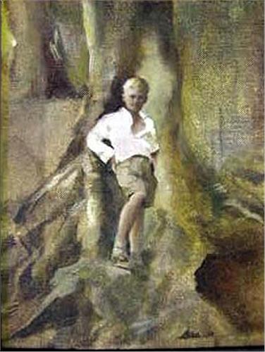 A MIXED MEDIA ON BOARD; Depicting young man standing in front of a tree trunk Signed LR NL 7"h x 9"w