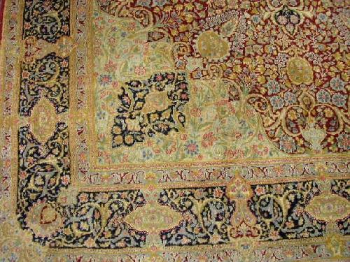 A MODERN IRANIAN "ORIENTAL" RUG; with a central burgundy medallion on an ivory field and blue border, 10'5"l x 8'w.