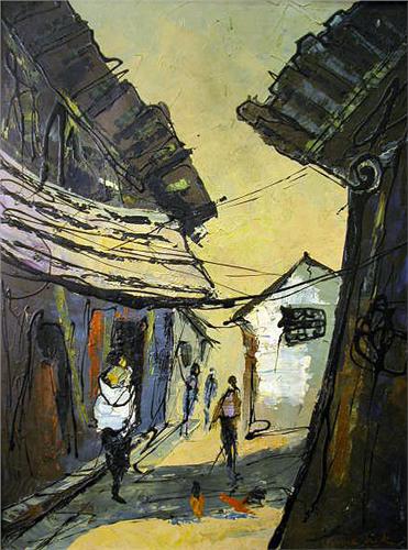 A MODERNISTIC OIL ON CANVAS; depicting a busy street, signed l.r. James Mak. Together with an oil on masonite depicting a peopled landscape, signed l.r. Morris Katz (American, born 1932). 2 pieces. The first 24" x 17 3/4"