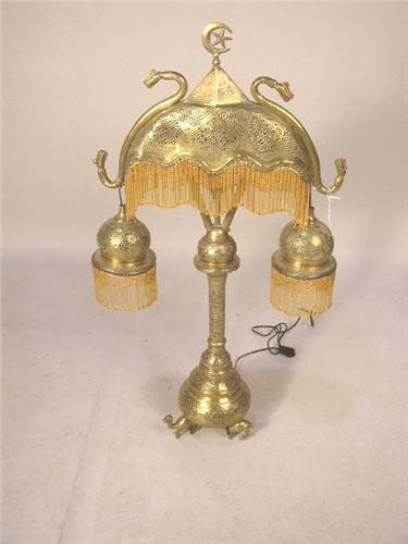 A MOORISH STYLE PIERCED BRASS TABLE LAMP; With three figural camel feet 42"h