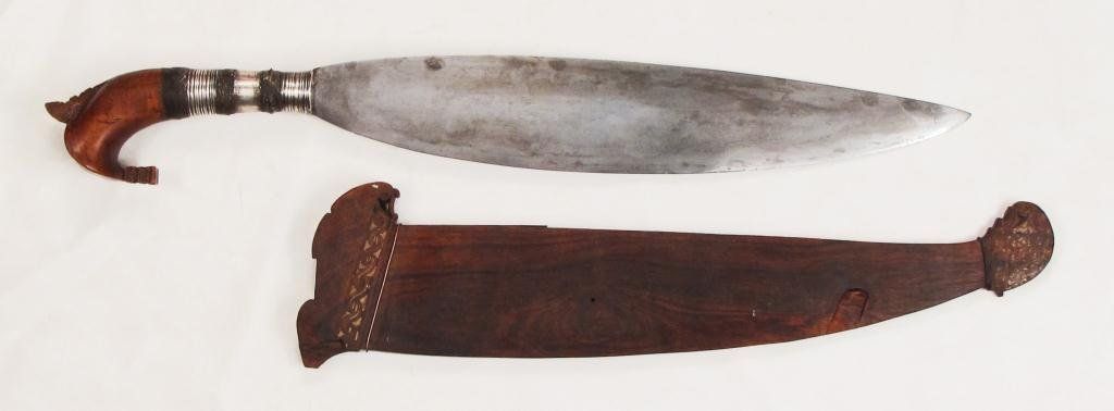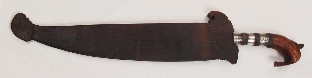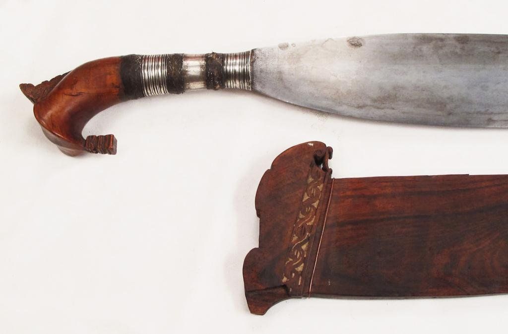 With finely crested and carved pommel and silver ferrule, and massive, pattern-welded blade. In its carved and pierced wooden scabbard. Latter 19th century.Minor loss to scabbard .Overall length 59.6 cm. Condition II