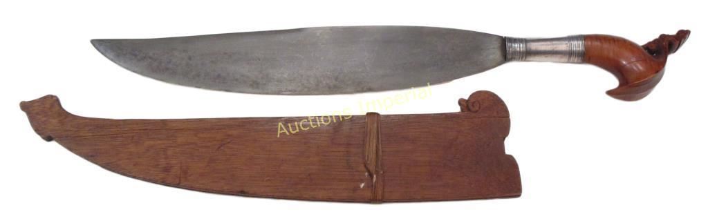 The grip carved of banati wood with elaborately-crested kakatua pommel and silver ferrule. The handforged shandigan-type blade with raised, chamfered cutting edge and long back edge, with active damascus steel pattern. In its well-grained hardwood scabbard with throat and tip carved in okkir motifs with rattan binding. Latter 19th century. Minor losses, cracks and chips. Overall length 64 cm.
