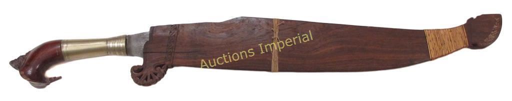 The grip carved of banati wood with crested kakatua pommel and silvered ferrule. The long blade retains much original sharpness. In an associated hardwood scabbard with carved throat and tip with rattan binding. Second quarter of the 20th century. Wooden parts chipped. Overall length 67.8 cm.