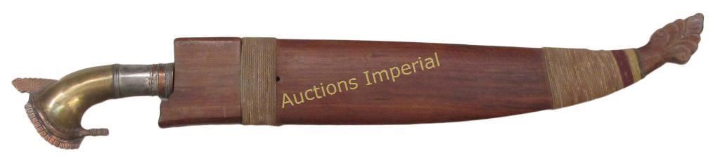 A large example, the crested grip wrought entirely of copper and brass, with silvered ferrule. The massive blade with hardened edge. In its carved and cord-bound wooden scabbard. 2nd quarter of the 20th century. Minor wear . Overall length 62.4 cm.