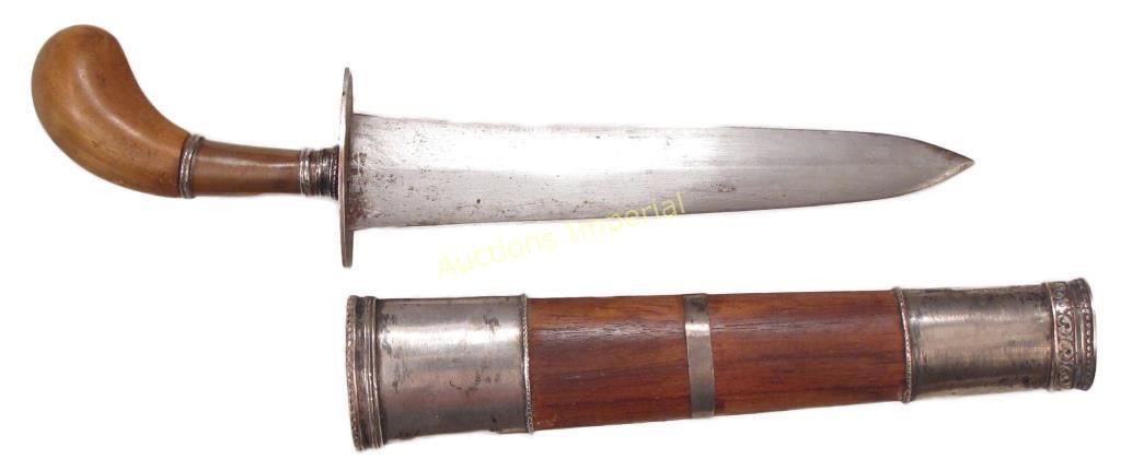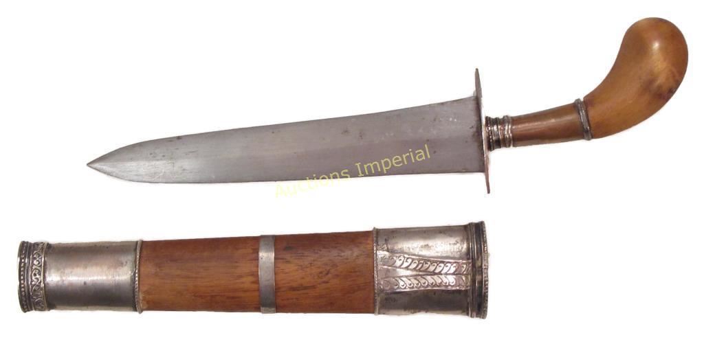Wooden handle with straight blade. In its matching scabbard. Early 20th century.