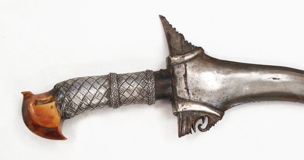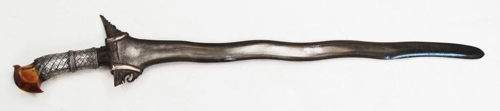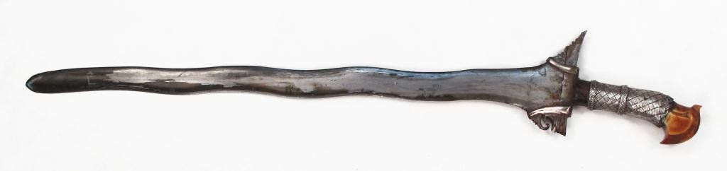 Withkakatua-form pommel and elaborately braided silver wire-wrapped grip, with baka-baka intact.The substantial seven-waved blade with layered forging visible.Mid-19th century.Donated to the John Woodman Higgins Armory Museum, Worcester, Massachusetts, on May 9, 1957 by Nathaniel Sage, Jr. and William H. Sage III, grandsons of Brigadier General William Hamden Sage (1859-1922.) General Sage was professor of Military Sciences and Tactics, Central University of Kentucky, Richmond, 1892-93. He acted as Aide-de-Camp to General Ovenshine in the Philippines in 1898, where he further served as Adjutant General, 1st and 2nd Brigades, 1st Division, XIII Army Corps, Adjutant General, 3rd District, Mindanao, Jolo and Malsbang, Philippines, 1906. He was awarded the Medal of Honor for service during the Philippine Insurrection at Zapote River, June 13, 1899. His citation reads: With 9 men volunteered to hold an advanced position and held it against a terrific fire of the enemy estimated at 1,000 strong. Taking a rifle from a wounded man, and cartridges from the belts of others, Captain Sage himself killed 5 of the enemy. Overall length 58.5 cm. Condition I