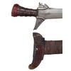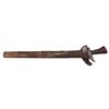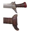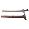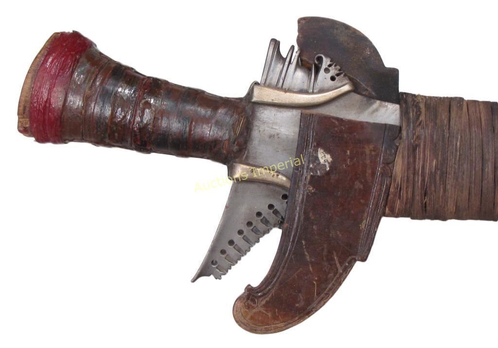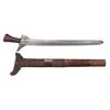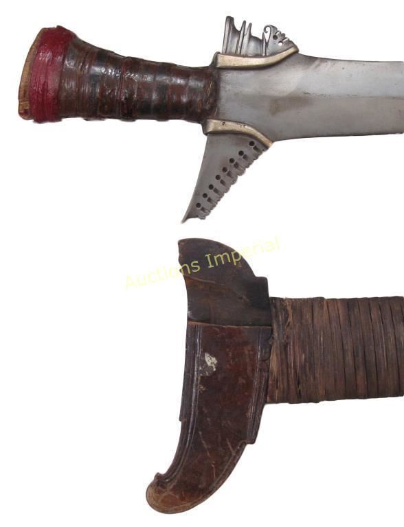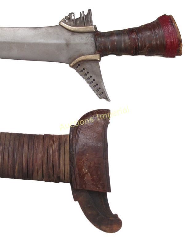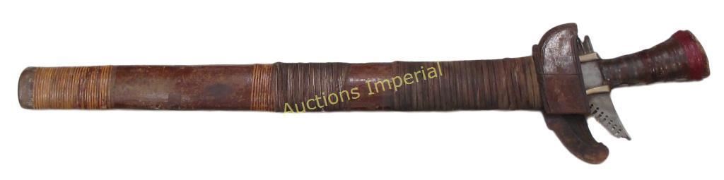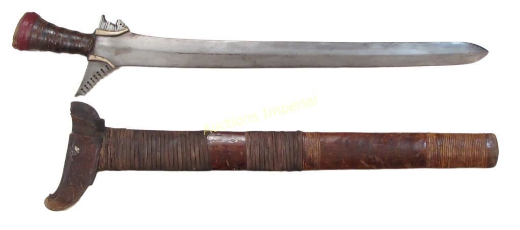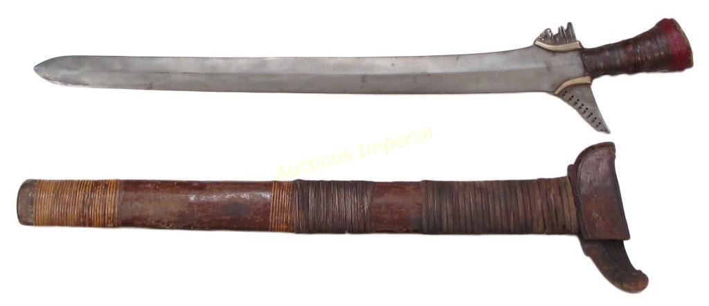 With wooden cord-wrapped grip. The straight, double-edged blade with silver baca-baca and evidence of layered forging. In its associated wooden scabbard with carved throat. Late 19th century. Losses to scabbard. Overall length 72.5 cm.