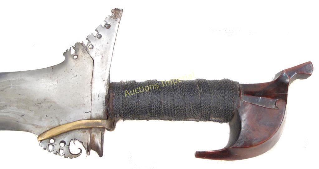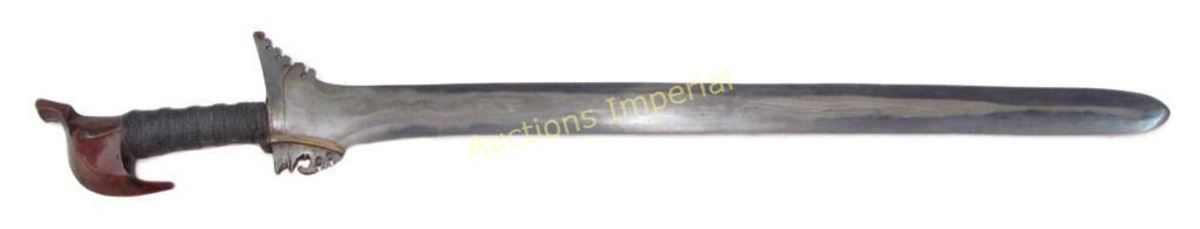 With large, finely-carved kakatua-form hardwood pommel and cord-wrapped grip and brass baca-baca. The robust blade forged in a complex pattern-weld with hardened edgesseparate ganja. Latter 19th century. Light wear. Overall length 69 cm.