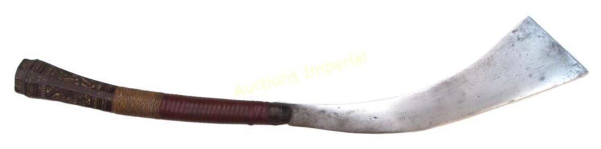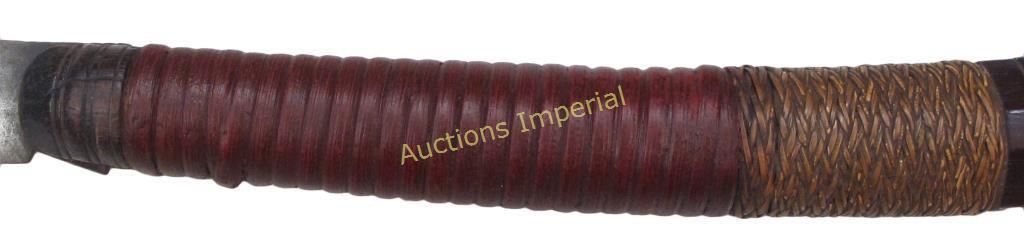 The long, broad handforged blade with distinctive curve and expanded tip showing its layered construction, the wooden grip well-carved in okkir motifs at the pommel, with tightly plaited rattan and red-lacquered cane bindings intact. Mid-19th century. Overall length 78 cm.