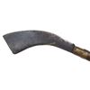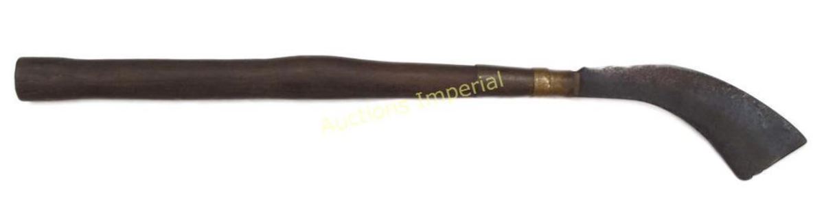 The heavy blade with distinctive curve and profiled tip, the wooden grip with brass mounts. Latter 19th century. Blade pitted. Overall length 71.8 cm.