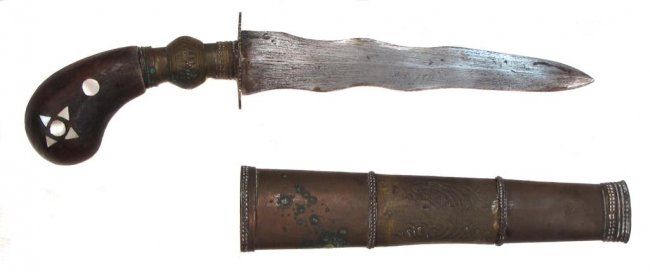 Wooden handle with mother of pearl inlays, waved blade. In its brass scabbard.2nd quarter of the 20th century.