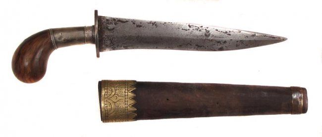 Wooden handle with handforged blade. In its matching scabbard.Early 20th century.