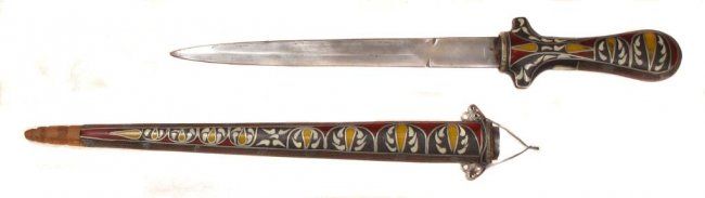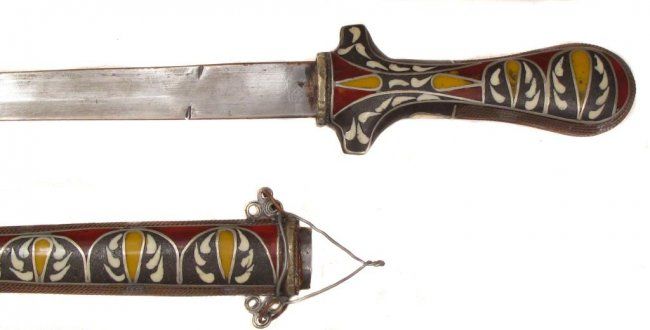 The mounts with champlev? enamel-type work, straight, double-edged blade. In its matching scabbard.First half of the 20th century. Tip lacking. Overall length 49.5 cm.