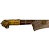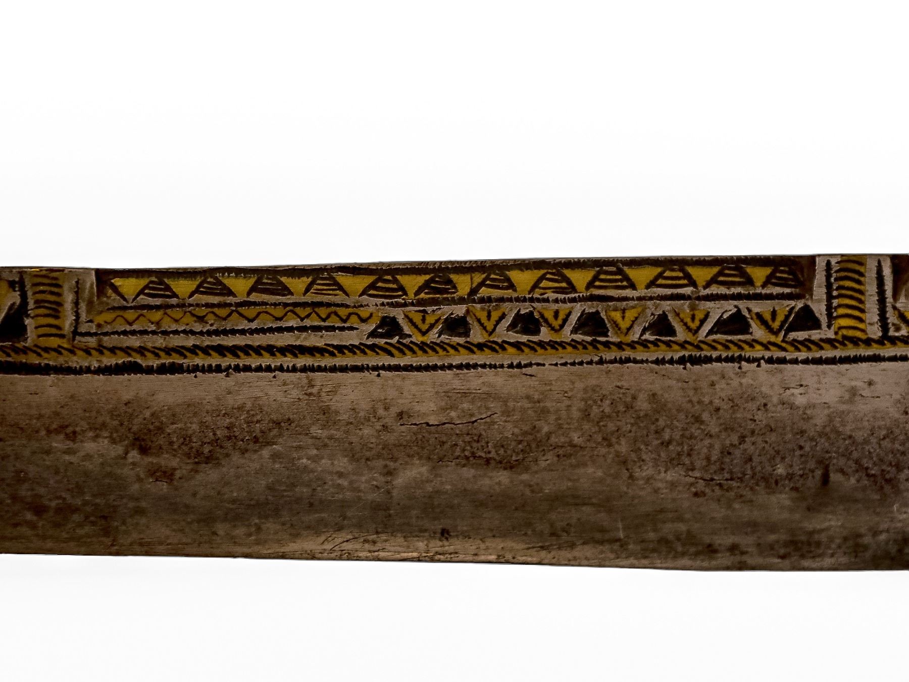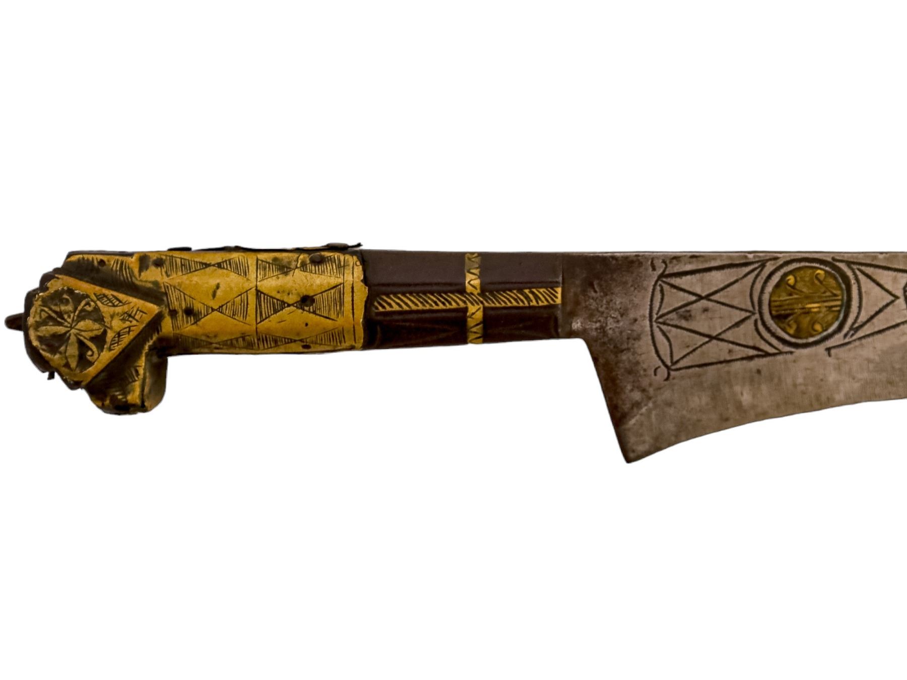 The hilt is made of steel and wood covered with engraved brass in a shape of a stylized animal head. Rare and complete.