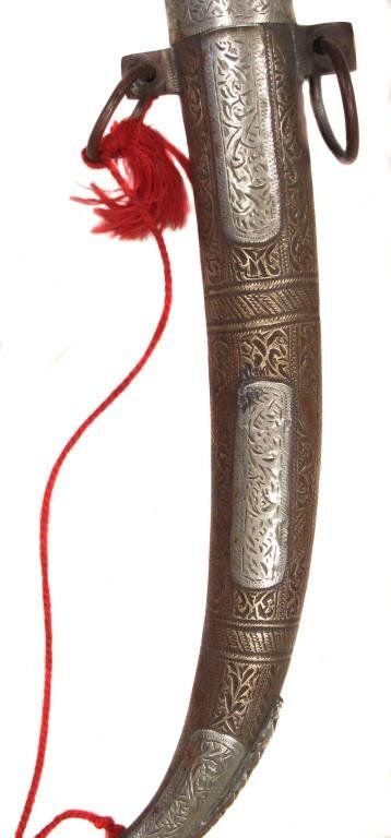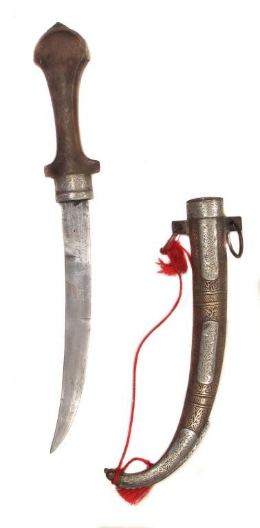 With wood grip and steel blade, engraved brass scabbard. First half of the 20th century.Worn.Overall length 42.9 cm.
