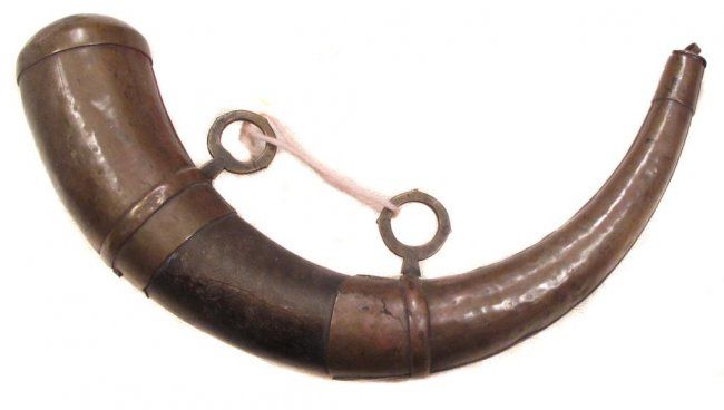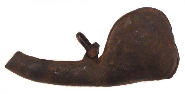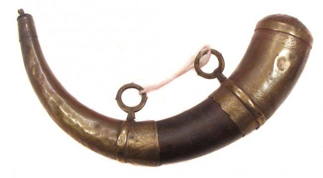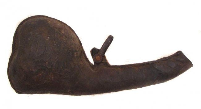 The first of horn with engraved brass mounts, the second of rawhide with incised motifs.