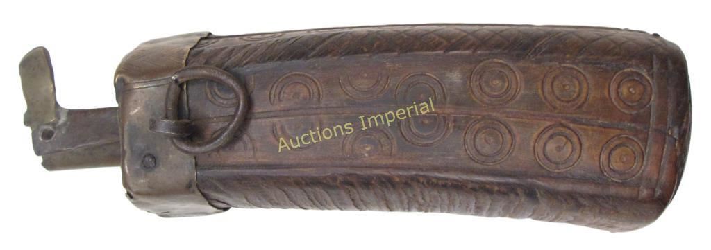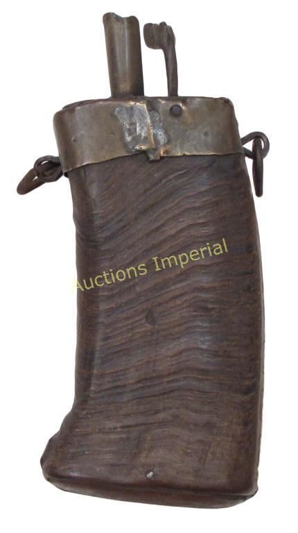 Of characteristic form, well-made from a large section of horn with incised circular motifs, the cap and spout of brass with cutoff. Iron suspension rings. First half of the 19th century. Light wear. Overall length 19.9 cm.