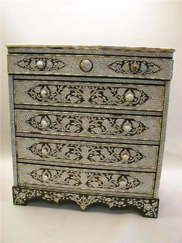 A MOROCCAN STYLE BONE AND MOTHER-OF-PEARL MARBLE-TOP TALL CHEST OF DRAWERS; The shaped top above five long drawers and a shaped apron on bracket feet (losses) 4"h x 44 1/2"w x 19"d