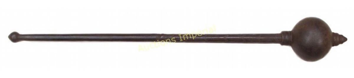 Wrought of solid steel, the spherical head surmounted by a stepped finial. The haft faceted with stepped, spherical bead at the center, the remainder of round section with lotus bud terminal. Late 16th-early 17th century. Brown overall. While short, such maces were quite heavy and worn through the belt at the small of the back for use in close quarters. Overall length 38.8 cm.