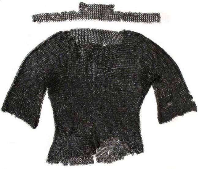 Comprising a coat, collar and breeches, wrought in alternating rows of heavy riveted and solid rings. The collar with raised nape section, coat with half-sleeves, the breeches with cuffs pointed to cover the instep. First half of the 17th century .Some losses.Length of coat 64 cm.